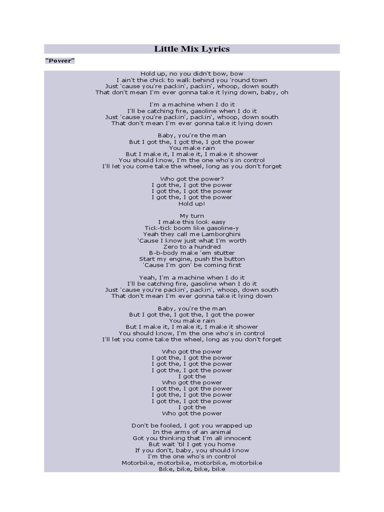 Here little mix assert that they have just as much power in relationships as a man does. But i got the i got the i got the power you make rain but i ll make it i ll make it i ll make it shower you should know i m the one who s in control i ll let you come take the wheel long as you don t forget who got the power i got the i got the power i got the i got the power i got the i got the power i got the who got the power. But i got the i got the i got the power you make rain but i make it i make it i make it shower you should know i m the one who s in control i ll let you come take the wheel long as you don t forget who got the power i got the i got the power i got the i got the power i got the i got the power i got the who got the power i got the i. Hold up no you didn t bow bow i ain t the chick to walk behind you around town just cause you re packin packin whoop down south that don t mean i m ever gonna take it laying down baby oh i m a machine when i do it i ll be catching fire gasoline when i do it just cause.
